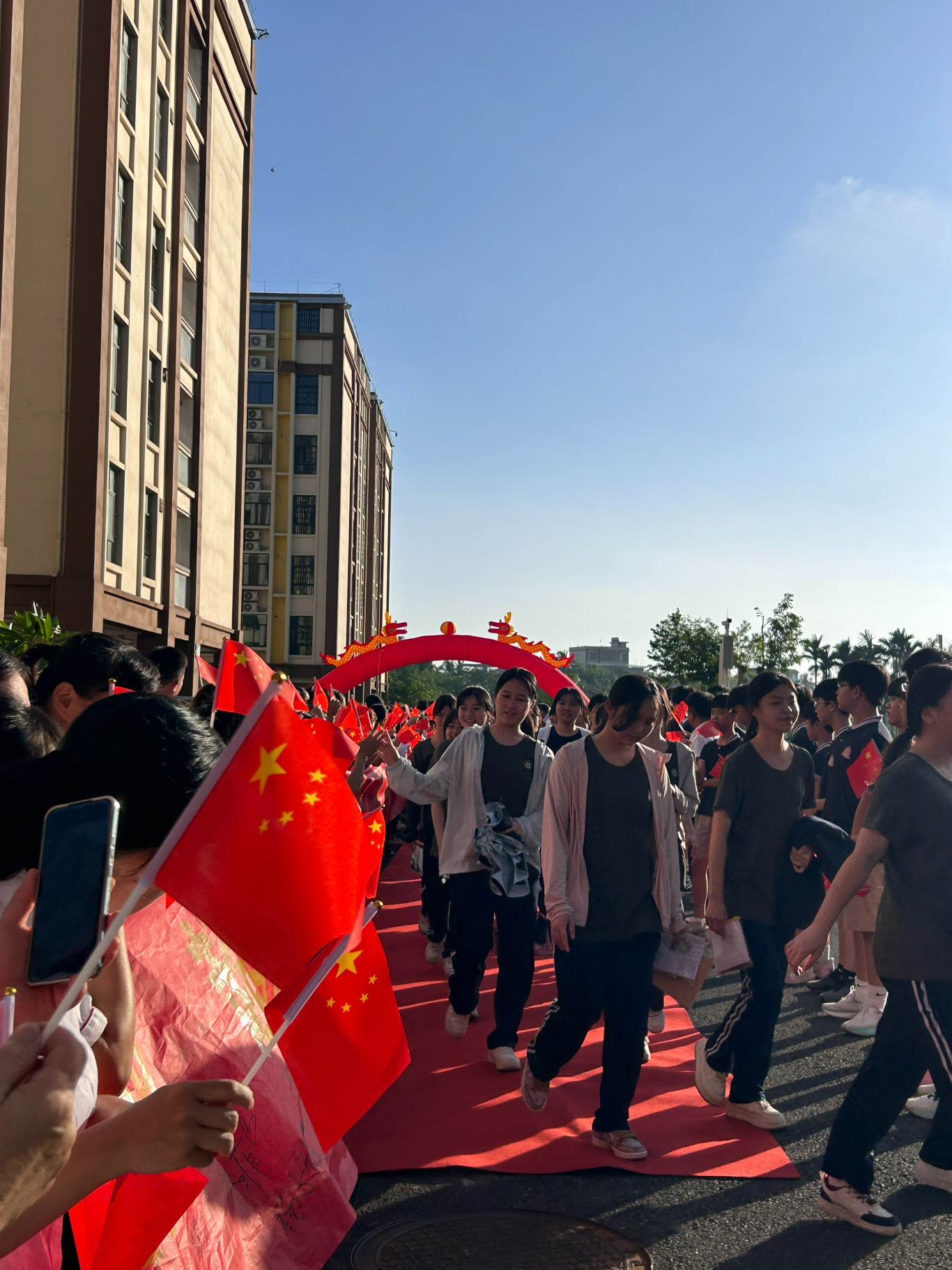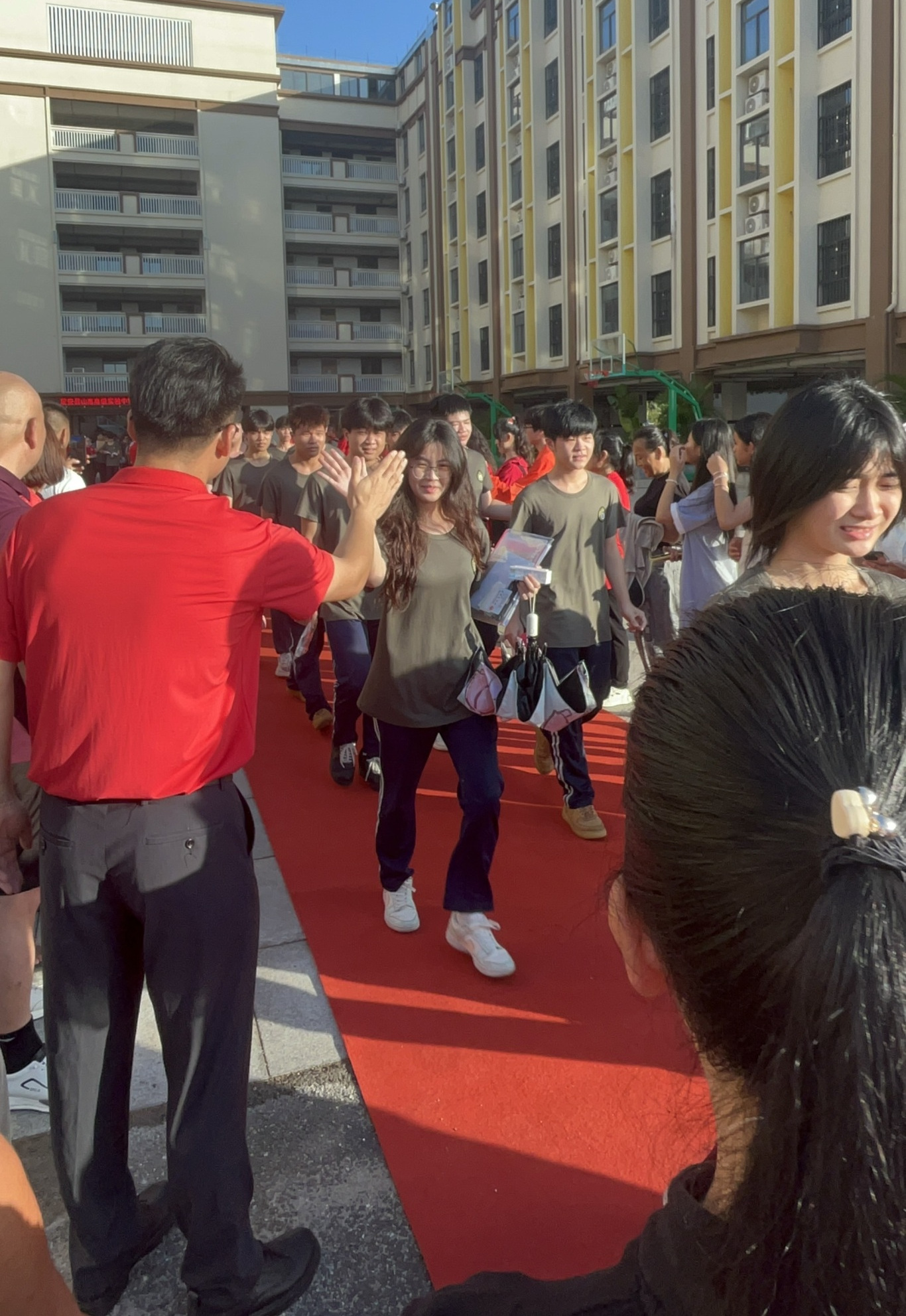 活動現(xiàn)場,一條條鮮艷的紅毯整齊鋪開,仿佛在為學(xué)子們指引通往夢想的道路。伴隨著激昂的擂鼓聲,聲聲鏗鏘,傳遞著力量與祝福,也敲出了學(xué)子們必勝的信心。定安山高執(zhí)行董事江家華發(fā)言話語中滿是對學(xué)子們的殷切期望與真摯祝福。他回顧了同學(xué)們在校園里奮斗的點滴時光,鼓勵大家在考場上沉著冷靜、穩(wěn)定發(fā)揮,將三年來積累的知識與力量盡情釋放。定安山高執(zhí)行董事江家華的鼓舞如同一股暖流,流淌在每位學(xué)子心間,點燃了大家心中的斗志。彭江江副校長在紅毯旁和學(xué)生們擊掌,傳遞著無聲的鼓勵。