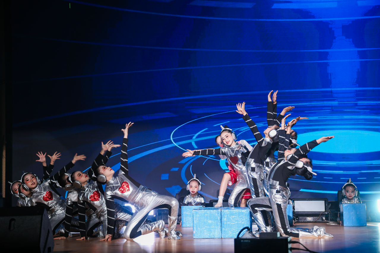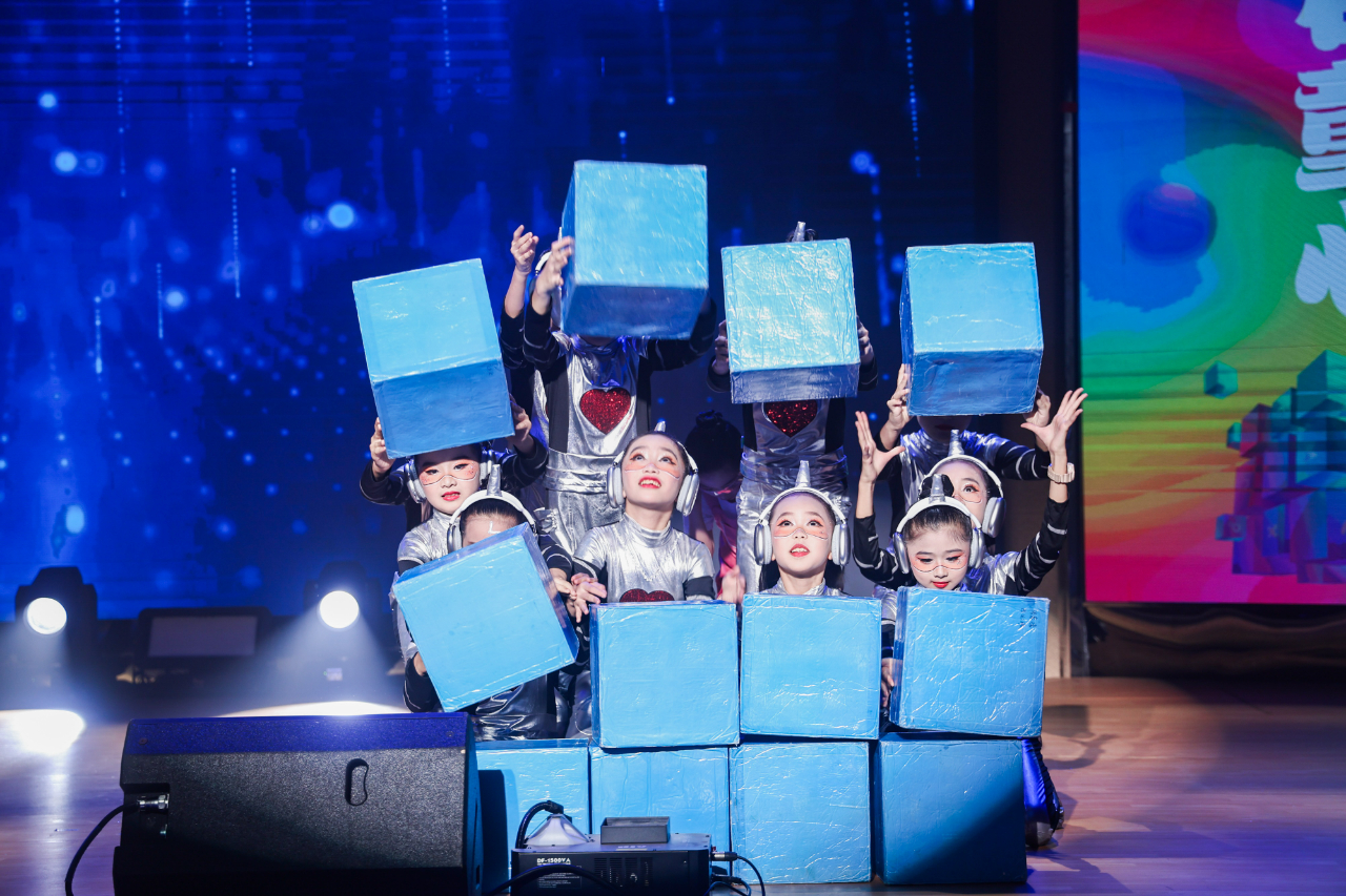 四年級學(xué)子以舞蹈《AI 的陪伴》,用靈動肢體演繹 AI 與人類的友好互動。在代碼流光與機器人的節(jié)奏中,探尋科技冰冷表象下,與人文交織的溫暖聯(lián)結(jié)。