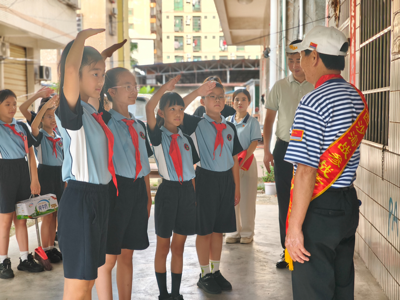 第一位慰問的是海軍老兵王當(dāng)琳同志。雖已年逾古稀,但老人精神矍鑠,談及當(dāng)年的抗戰(zhàn)經(jīng)歷,眼神中依然閃爍著堅毅的光芒。他緩緩講述著戰(zhàn)爭年代的艱辛與不易,那些血與火的考驗、生與死的抉擇,仿佛把孩子們帶回了那個硝煙彌漫的年代。