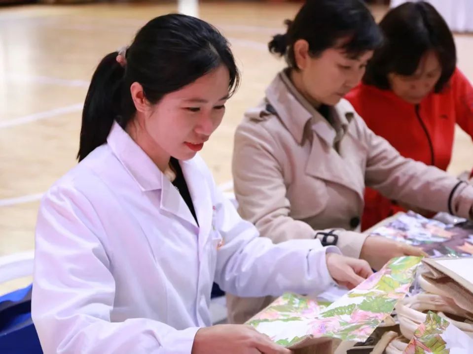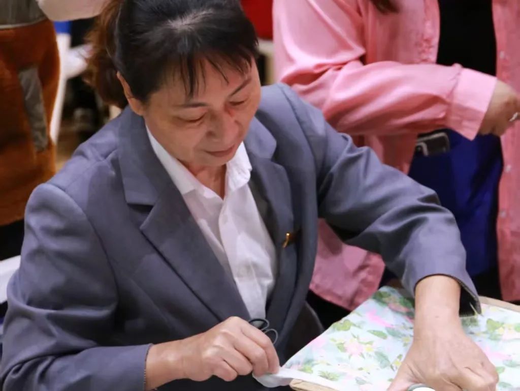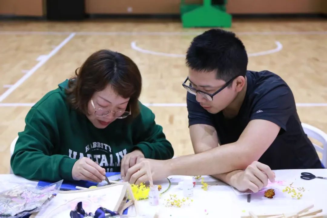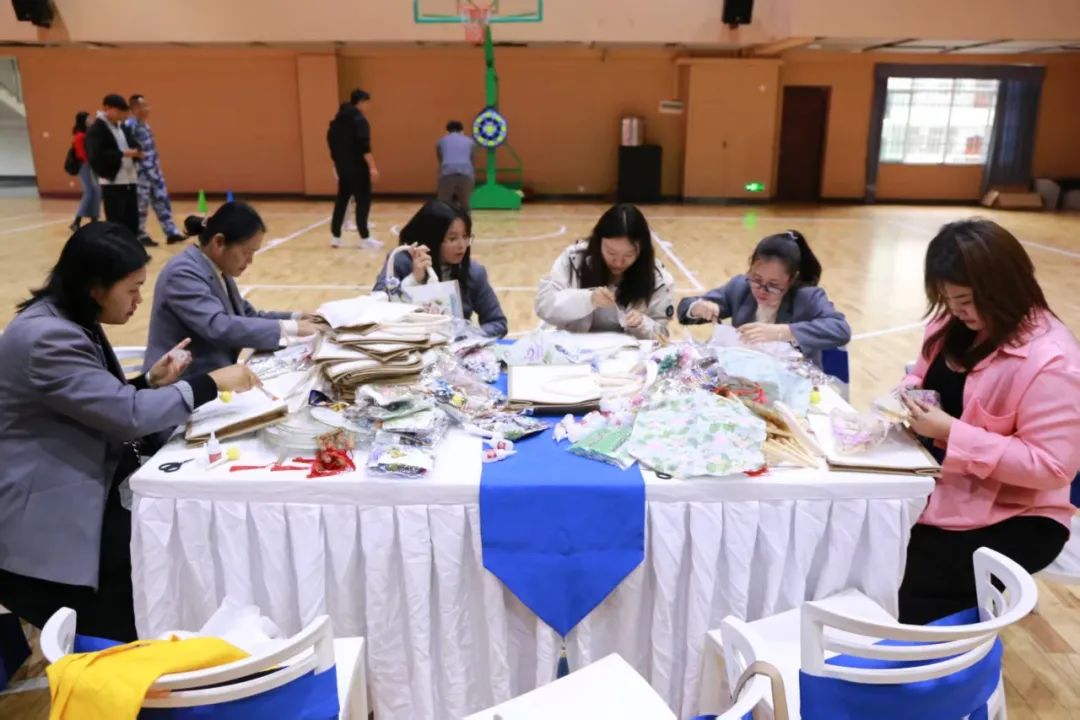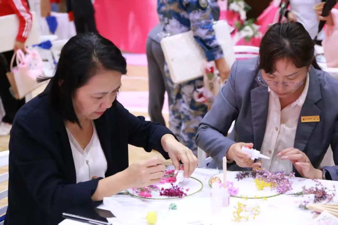 女教職工們簇擁而坐,細心制作永生花團扇、花燈、手工包等,體驗手工樂趣,展現(xiàn)藝術(shù)風(fēng)采。